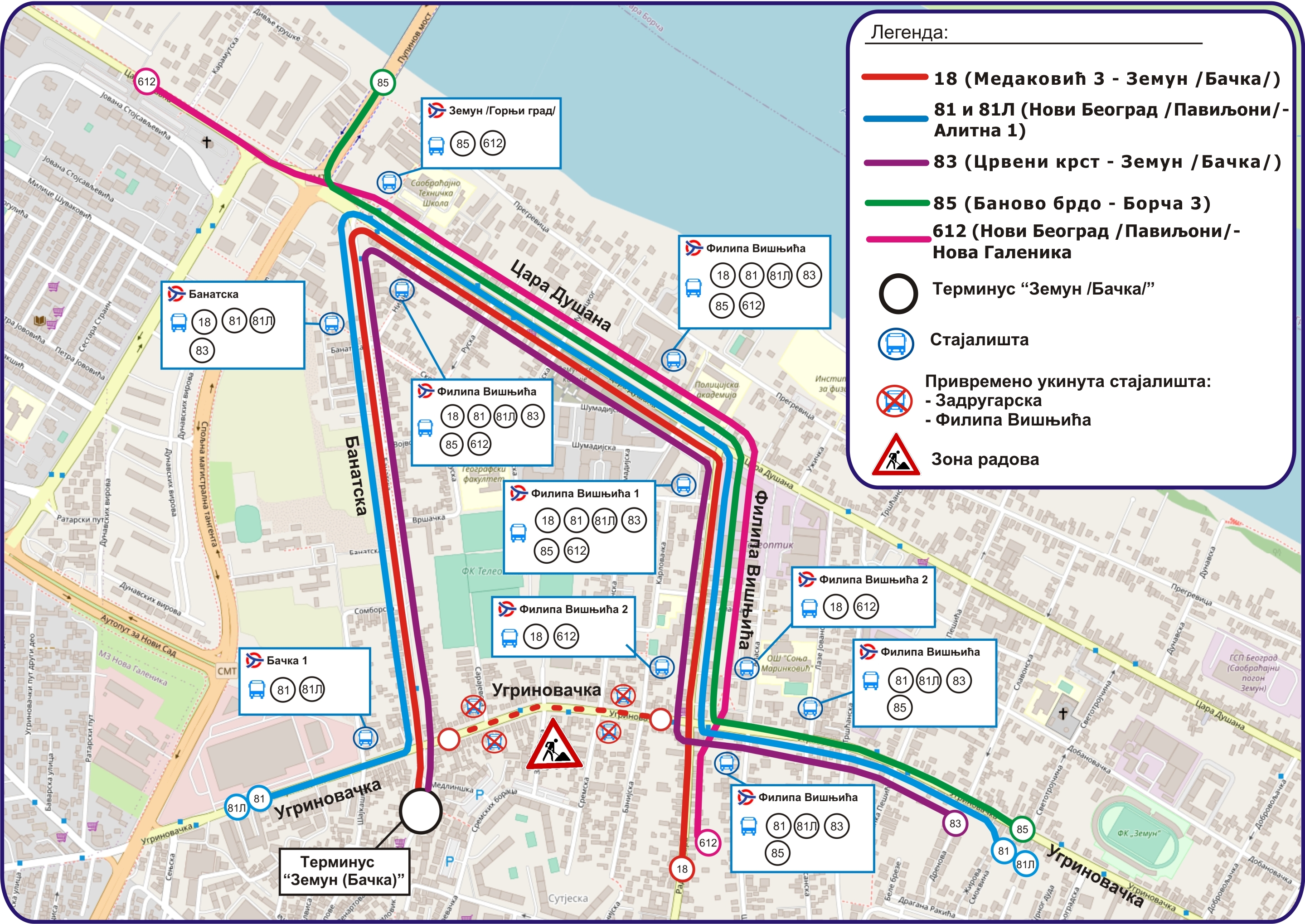- Возила са линијa бр. 81 и 81Л, ће у оба смера, на делу од раскрснице улица Филипа Вишњића-Угриновачка до раскрснице улица Банатска-Угриновачка саобраћати следећим улицама: Угриновачка, Филипа Вишњића, Цара Душана, Банатска, Угриновачка и даље редовним трасама;