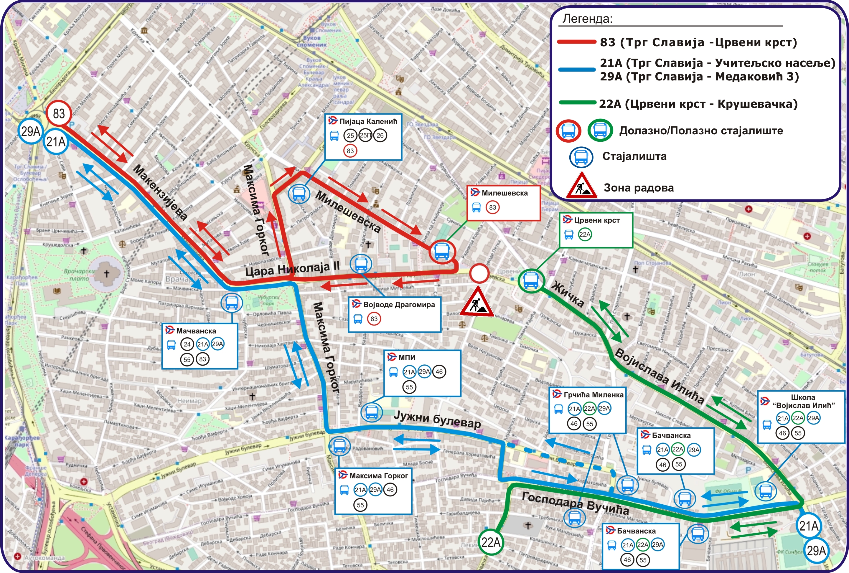 - Возила са линије бр. 22А ће саобраћати у оба смера улицама: Црвени крст, Милешевска, (Војводе Шупљикца у смеру ка Црвеном крсту), Жичка, Војислава Илића, Господара Вучића, Крушевачка;