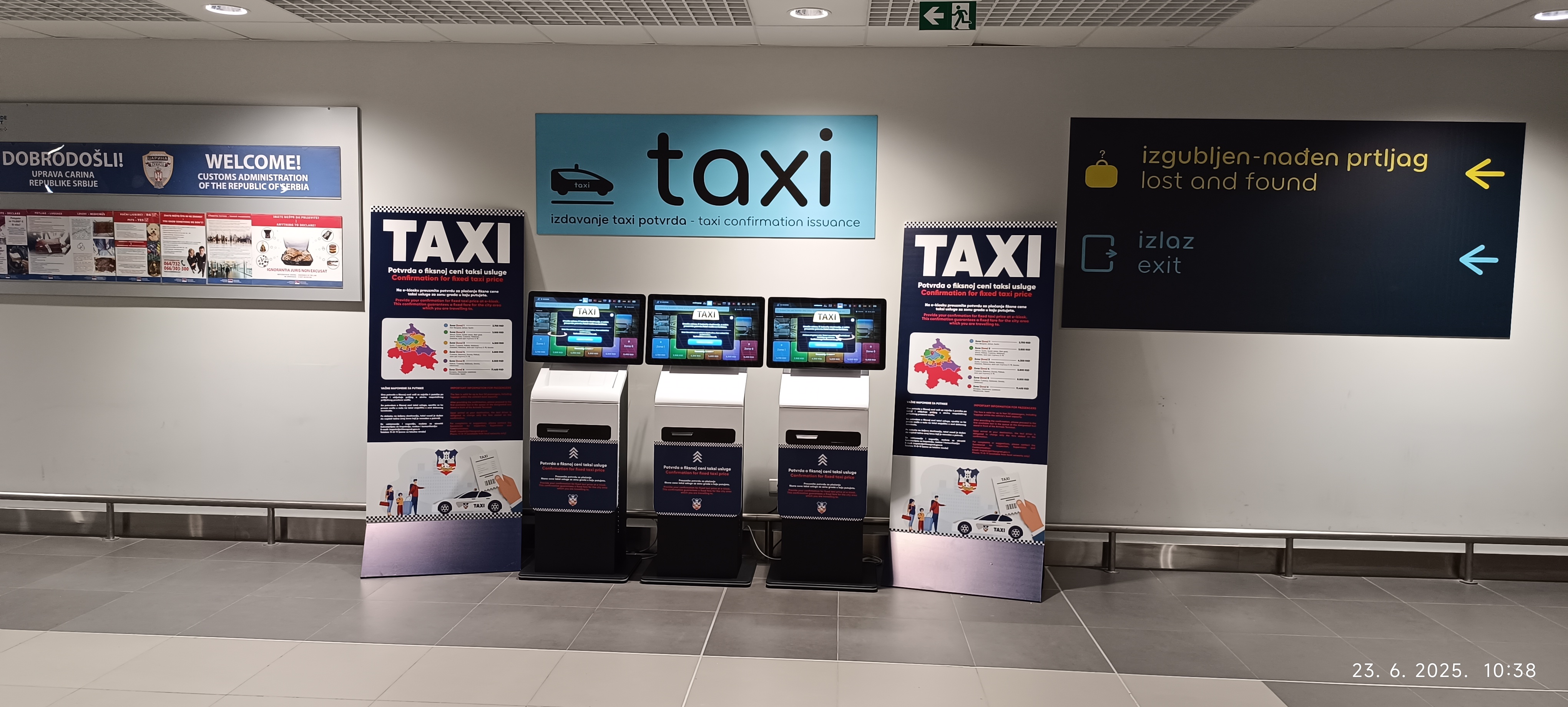 Издавање Потврда о фиксној цени такси услуге се врши путем четири е-киоска (терминал) на којима путници могу брзо и једноставно преузети своју потврду пре него што приступе такси стајалишту.